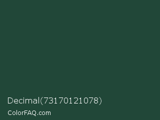 Decimal 73170121078 Color is a very dark green color and the nearest color is Te Papa Green #1e433c. Hex code #214738 and RGB value is rgb(33,71,56). In RGB color space, this color is composed of 13% red, 28% green, 22% blue, In CMYK color space, this color is composed of 54% cyan, 0% magenta, 21% yellow , 72% black , In HSL color space, this color has a hue angle of 156° , 37% saturation and 20% lightness.