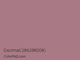 Decimal 286288208 Color is a normal red color and the nearest color is Pharlap #a3807b. Hex code #a97a86 and RGB value is rgb(169,122,134). In RGB color space, this color is composed of 66% red, 48% green, 53% blue, In CMYK color space, this color is composed of 0% cyan, 28% magenta, 21% yellow , 34% black , In HSL color space, this color has a hue angle of 345° , 21% saturation and 57% lightness.