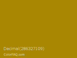 Decimal 286327109 Color is a normal yellow color and the nearest color is Hot Toddy #b38007. Hex code #a98701 and RGB value is rgb(169,135,1). In RGB color space, this color is composed of 66% red, 53% green, 0% blue, In CMYK color space, this color is composed of 0% cyan, 20% magenta, 99% yellow , 34% black , In HSL color space, this color has a hue angle of 48° , 99% saturation and 33% lightness.
