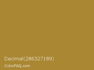 Decimal 286327189 Color is a normal orange color and the nearest color is Luxor Gold #a7882c. Hex code #a98733 and RGB value is rgb(169,135,51). In RGB color space, this color is composed of 66% red, 53% green, 20% blue, In CMYK color space, this color is composed of 0% cyan, 20% magenta, 70% yellow , 34% black , In HSL color space, this color has a hue angle of 43° , 54% saturation and 43% lightness.