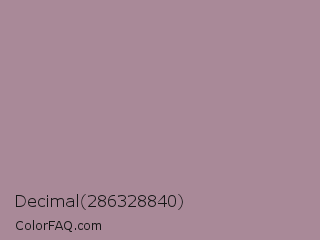 Decimal 286328840 Color is a normal rose color and the nearest color is Bouquet #ae809e. Hex code #a98998 and RGB value is rgb(169,137,152). In RGB color space, this color is composed of 66% red, 54% green, 60% blue, In CMYK color space, this color is composed of 0% cyan, 19% magenta, 10% yellow , 34% black , In HSL color space, this color has a hue angle of 332° , 16% saturation and 60% lightness.