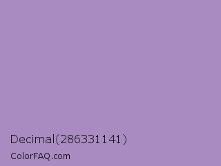 Decimal 286331141 Color is a light purple color and the nearest color is African Violet #b284be. Hex code #a98ac1 and RGB value is rgb(169,138,193). In RGB color space, this color is composed of 66% red, 54% green, 76% blue, In CMYK color space, this color is composed of 12% cyan, 28% magenta, 0% yellow , 24% black , In HSL color space, this color has a hue angle of 274° , 31% saturation and 65% lightness.