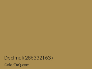 Decimal 286332163 Color is a normal orange color and the nearest color is Limed Oak #ac8a56. Hex code #a98c4f and RGB value is rgb(169,140,79). In RGB color space, this color is composed of 66% red, 55% green, 31% blue, In CMYK color space, this color is composed of 0% cyan, 17% magenta, 53% yellow , 34% black , In HSL color space, this color has a hue angle of 41° , 36% saturation and 49% lightness.