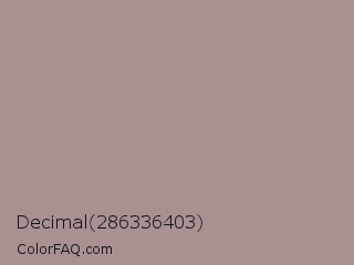 Decimal 286336403 Color is a light red color and the nearest color is Zorba #a59b91. Hex code #a99091 and RGB value is rgb(169,144,145). In RGB color space, this color is composed of 66% red, 56% green, 57% blue, In CMYK color space, this color is composed of 0% cyan, 15% magenta, 14% yellow , 34% black , In HSL color space, this color has a hue angle of 358° , 13% saturation and 61% lightness.