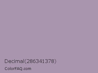 Decimal 286341378 Color is a light purple color and the nearest color is Heliotrope Gray #aa98a9. Hex code #a995ae and RGB value is rgb(169,149,174). In RGB color space, this color is composed of 66% red, 58% green, 68% blue, In CMYK color space, this color is composed of 3% cyan, 14% magenta, 0% yellow , 32% black , In HSL color space, this color has a hue angle of 288° , 13% saturation and 63% lightness.