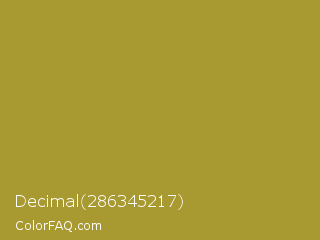 Decimal 286345217 Color is a normal yellow color and the nearest color is Alpine #af8f2c. Hex code #a99931 and RGB value is rgb(169,153,49). In RGB color space, this color is composed of 66% red, 60% green, 19% blue, In CMYK color space, this color is composed of 0% cyan, 9% magenta, 71% yellow , 34% black , In HSL color space, this color has a hue angle of 52° , 55% saturation and 43% lightness.