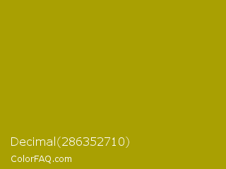 Decimal 286352710 Color is a normal yellow color and the nearest color is Sahara #b7a214. Hex code #a9a002 and RGB value is rgb(169,160,2). In RGB color space, this color is composed of 66% red, 63% green, 1% blue, In CMYK color space, this color is composed of 0% cyan, 5% magenta, 99% yellow , 34% black , In HSL color space, this color has a hue angle of 57° , 98% saturation and 34% lightness.