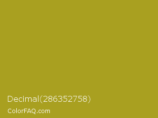 Decimal 286352758 Color is a normal yellow color and the nearest color is Lemon Ginger #ac9e22. Hex code #a9a020 and RGB value is rgb(169,160,32). In RGB color space, this color is composed of 66% red, 63% green, 13% blue, In CMYK color space, this color is composed of 0% cyan, 5% magenta, 81% yellow , 34% black , In HSL color space, this color has a hue angle of 56° , 68% saturation and 39% lightness.