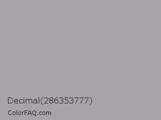Decimal 286353777 Color is a light purple color and the nearest color is Shady Lady #aaa5a9. Hex code #a9a1ab and RGB value is rgb(169,161,171). In RGB color space, this color is composed of 66% red, 63% green, 67% blue, In CMYK color space, this color is composed of 1% cyan, 6% magenta, 0% yellow , 33% black , In HSL color space, this color has a hue angle of 288° , 6% saturation and 65% lightness.
