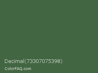 Decimal 73307075398 Color is a normal green color and the nearest color is Killarney #3a6a47. Hex code #436642 and RGB value is rgb(67,102,66). In RGB color space, this color is composed of 26% red, 40% green, 26% blue, In CMYK color space, this color is composed of 34% cyan, 0% magenta, 35% yellow , 60% black , In HSL color space, this color has a hue angle of 118° , 21% saturation and 33% lightness.