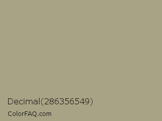 Decimal 286356549 Color is a normal yellow color and the nearest color is Hillary #aca586. Hex code #a9a385 and RGB value is rgb(169,163,133). In RGB color space, this color is composed of 66% red, 64% green, 52% blue, In CMYK color space, this color is composed of 0% cyan, 4% magenta, 21% yellow , 34% black , In HSL color space, this color has a hue angle of 50° , 17% saturation and 59% lightness.