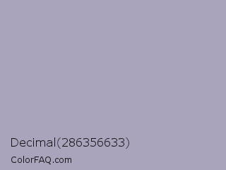 Decimal 286356633 Color is a light indigo color and the nearest color is Spun Pearl #aaabb7. Hex code #a9a3bb and RGB value is rgb(169,163,187). In RGB color space, this color is composed of 66% red, 64% green, 73% blue, In CMYK color space, this color is composed of 10% cyan, 13% magenta, 0% yellow , 27% black , In HSL color space, this color has a hue angle of 255° , 15% saturation and 69% lightness.