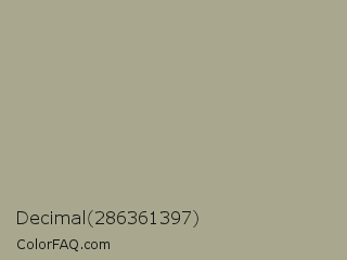 Decimal 286361397 Color is a light yellow color and the nearest color is Gray Olive #a9a491. Hex code #a9a88f and RGB value is rgb(169,168,143). In RGB color space, this color is composed of 66% red, 66% green, 56% blue, In CMYK color space, this color is composed of 0% cyan, 1% magenta, 15% yellow , 34% black , In HSL color space, this color has a hue angle of 58° , 13% saturation and 61% lightness.