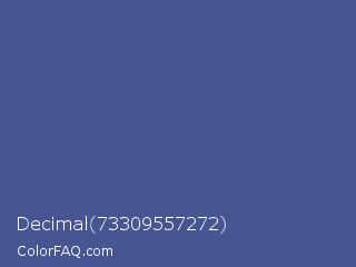 Decimal 73309557272 Color is a normal blue color and the nearest color is Purple Navy #4e5180. Hex code #475592 and RGB value is rgb(71,85,146). In RGB color space, this color is composed of 28% red, 33% green, 57% blue, In CMYK color space, this color is composed of 51% cyan, 42% magenta, 0% yellow , 43% black , In HSL color space, this color has a hue angle of 229° , 35% saturation and 43% lightness.