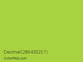 Decimal 286430217 Color is a normal lime color and the nearest color is Android Green #a4c639. Hex code #a9d241 and RGB value is rgb(169,210,65). In RGB color space, this color is composed of 66% red, 82% green, 25% blue, In CMYK color space, this color is composed of 20% cyan, 0% magenta, 69% yellow , 18% black , In HSL color space, this color has a hue angle of 77° , 62% saturation and 54% lightness.