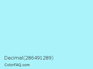 Decimal 286491289 Color is a very light cyan color and the nearest color is Waterspout #a4f4f9. Hex code #a9f4fb and RGB value is rgb(169,244,251). In RGB color space, this color is composed of 66% red, 96% green, 98% blue, In CMYK color space, this color is composed of 33% cyan, 3% magenta, 0% yellow , 2% black , In HSL color space, this color has a hue angle of 185° , 91% saturation and 82% lightness.