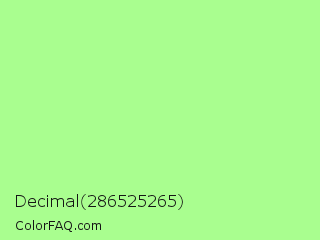 Decimal 286525265 Color is a light green color and the nearest color is Mint Green #98ff98. Hex code #a9fe8f and RGB value is rgb(169,254,143). In RGB color space, this color is composed of 66% red, 100% green, 56% blue, In CMYK color space, this color is composed of 33% cyan, 0% magenta, 44% yellow , 0% black , In HSL color space, this color has a hue angle of 106° , 98% saturation and 78% lightness.