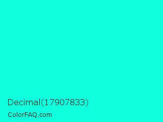 Decimal 17907833 Color is a normal cyan color and the nearest color is Turquoise Blue #00ffef. Hex code #10ffdf and RGB value is rgb(16,255,223). In RGB color space, this color is composed of 6% red, 100% green, 87% blue, In CMYK color space, this color is composed of 94% cyan, 0% magenta, 13% yellow , 0% black , In HSL color space, this color has a hue angle of 172° , 100% saturation and 53% lightness.