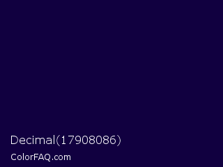 Decimal 17908086 Color is a very dark indigo color and the nearest color is Tolopea #1b0245. Hex code #110040 and RGB value is rgb(17,0,64). In RGB color space, this color is composed of 7% red, 0% green, 25% blue, In CMYK color space, this color is composed of 73% cyan, 100% magenta, 0% yellow , 75% black , In HSL color space, this color has a hue angle of 256° , 100% saturation and 13% lightness.