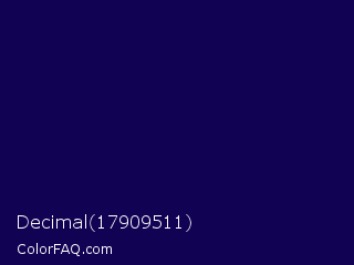 Decimal 17909511 Color is a very dark indigo color and the nearest color is Tolopea #1b0245. Hex code #110253 and RGB value is rgb(17,2,83). In RGB color space, this color is composed of 7% red, 1% green, 33% blue, In CMYK color space, this color is composed of 80% cyan, 98% magenta, 0% yellow , 67% black , In HSL color space, this color has a hue angle of 251° , 95% saturation and 17% lightness.