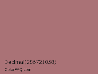 Decimal 286721058 Color is a normal red color and the nearest color is Burnished Brown #a17a74. Hex code #aa7276 and RGB value is rgb(170,114,118). In RGB color space, this color is composed of 67% red, 45% green, 46% blue, In CMYK color space, this color is composed of 0% cyan, 33% magenta, 31% yellow , 33% black , In HSL color space, this color has a hue angle of 356° , 25% saturation and 56% lightness.