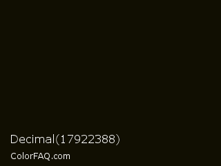 Decimal 17922388 Color is a almost black yellow color and the nearest color is Green Waterloo #101405. Hex code #110f02 and RGB value is rgb(17,15,2). In RGB color space, this color is composed of 7% red, 6% green, 1% blue, In CMYK color space, this color is composed of 0% cyan, 12% magenta, 88% yellow , 93% black , In HSL color space, this color has a hue angle of 52° , 79% saturation and 4% lightness.
