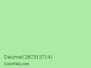 Decimal 287315714 Color is a light green color and the nearest color is Granny Smith Apple #a8e4a0. Hex code #aaeca6 and RGB value is rgb(170,236,166). In RGB color space, this color is composed of 67% red, 93% green, 65% blue, In CMYK color space, this color is composed of 28% cyan, 0% magenta, 30% yellow , 7% black , In HSL color space, this color has a hue angle of 117° , 65% saturation and 79% lightness.