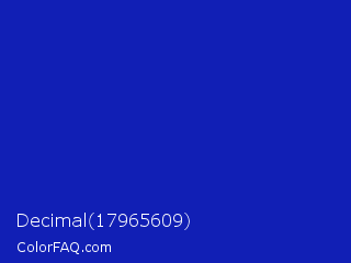 Decimal 17965609 Color is a normal blue color and the nearest color is Blue Pantone #0018a8. Hex code #111fb5 and RGB value is rgb(17,31,181). In RGB color space, this color is composed of 7% red, 12% green, 71% blue, In CMYK color space, this color is composed of 91% cyan, 83% magenta, 0% yellow , 29% black , In HSL color space, this color has a hue angle of 235° , 83% saturation and 39% lightness.