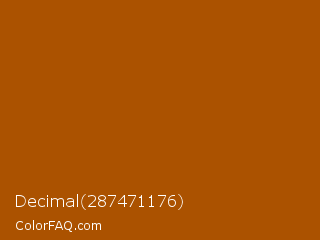 Decimal 287471176 Color is a normal orange color and the nearest color is Windsor Tan #a75502. Hex code #ab5200 and RGB value is rgb(171,82,0). In RGB color space, this color is composed of 67% red, 32% green, 0% blue, In CMYK color space, this color is composed of 0% cyan, 52% magenta, 100% yellow , 33% black , In HSL color space, this color has a hue angle of 29° , 100% saturation and 34% lightness.
