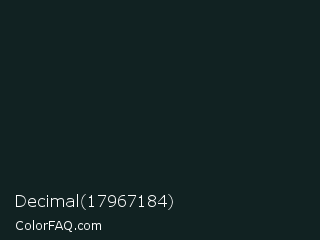 Decimal 17967184 Color is a very dark cyan color and the nearest color is Dark Jungle Green #1a2421. Hex code #112222 and RGB value is rgb(17,34,34). In RGB color space, this color is composed of 7% red, 13% green, 13% blue, In CMYK color space, this color is composed of 50% cyan, 0% magenta, 0% yellow , 87% black , In HSL color space, this color has a hue angle of 180° , 33% saturation and 10% lightness.