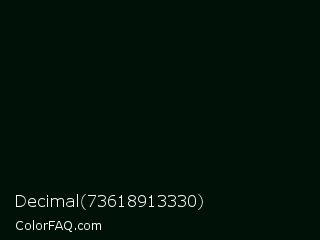 Decimal 73618913330 Color is a almost black green color and the nearest color is Midnight Moss #041004. Hex code #001108 and RGB value is rgb(0,17,8). In RGB color space, this color is composed of 0% red, 7% green, 3% blue, In CMYK color space, this color is composed of 100% cyan, 0% magenta, 53% yellow , 93% black , In HSL color space, this color has a hue angle of 148° , 100% saturation and 3% lightness.