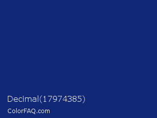 Decimal 17974385 Color is a dark blue color and the nearest color is Catalina Blue #062a78. Hex code #112877 and RGB value is rgb(17,40,119). In RGB color space, this color is composed of 7% red, 16% green, 47% blue, In CMYK color space, this color is composed of 86% cyan, 66% magenta, 0% yellow , 53% black , In HSL color space, this color has a hue angle of 226° , 75% saturation and 27% lightness.