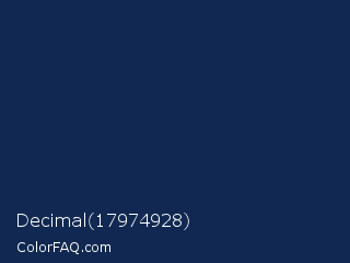 Decimal 17974928 Color is a very dark blue color and the nearest color is Blue Zodiac #13264d. Hex code #112952 and RGB value is rgb(17,41,82). In RGB color space, this color is composed of 7% red, 16% green, 32% blue, In CMYK color space, this color is composed of 79% cyan, 50% magenta, 0% yellow , 68% black , In HSL color space, this color has a hue angle of 218° , 66% saturation and 19% lightness.