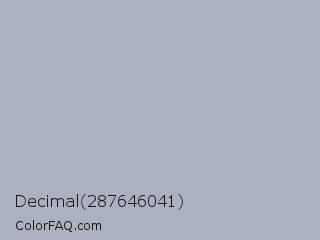 Decimal 287646041 Color is a light blue color and the nearest color is Cadet Blue #a9b2c3. Hex code #abb1bf and RGB value is rgb(171,177,191). In RGB color space, this color is composed of 67% red, 69% green, 75% blue, In CMYK color space, this color is composed of 10% cyan, 7% magenta, 0% yellow , 25% black , In HSL color space, this color has a hue angle of 222° , 14% saturation and 71% lightness.