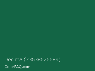 Decimal 73638626689 Color is a dark green color and the nearest color is Jewel #126b40. Hex code #136545 and RGB value is rgb(19,101,69). In RGB color space, this color is composed of 7% red, 40% green, 27% blue, In CMYK color space, this color is composed of 81% cyan, 0% magenta, 32% yellow , 60% black , In HSL color space, this color has a hue angle of 157° , 68% saturation and 24% lightness.