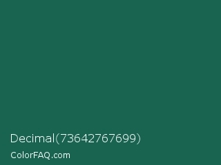 Decimal 73642767699 Color is a dark cyan color and the nearest color is Eden #105852. Hex code #196451 and RGB value is rgb(25,100,81). In RGB color space, this color is composed of 10% red, 39% green, 32% blue, In CMYK color space, this color is composed of 75% cyan, 0% magenta, 19% yellow , 61% black , In HSL color space, this color has a hue angle of 165° , 60% saturation and 25% lightness.
