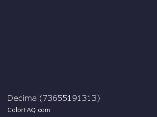 Decimal 73655191313 Color is a very dark blue color and the nearest color is Steel Gray #262335. Hex code #222337 and RGB value is rgb(34,35,55). In RGB color space, this color is composed of 13% red, 14% green, 22% blue, In CMYK color space, this color is composed of 38% cyan, 36% magenta, 0% yellow , 78% black , In HSL color space, this color has a hue angle of 237° , 24% saturation and 17% lightness.