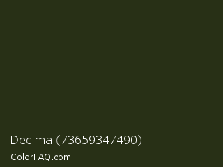Decimal 73659347490 Color is a very dark lime color and the nearest color is Black Olive #242e16. Hex code #283016 and RGB value is rgb(40,48,22). In RGB color space, this color is composed of 16% red, 19% green, 9% blue, In CMYK color space, this color is composed of 17% cyan, 0% magenta, 54% yellow , 81% black , In HSL color space, this color has a hue angle of 78° , 37% saturation and 14% lightness.