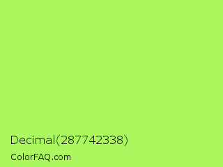 Decimal 287742338 Color is a light green color and the nearest color is Inchworm #b2ec5d. Hex code #abf75e and RGB value is rgb(171,247,94). In RGB color space, this color is composed of 67% red, 97% green, 37% blue, In CMYK color space, this color is composed of 31% cyan, 0% magenta, 62% yellow , 3% black , In HSL color space, this color has a hue angle of 90° , 91% saturation and 67% lightness.