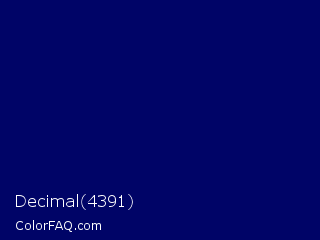 Decimal 4391 Color is a very dark blue color and the nearest color is Arapawa #110c6c. Hex code #000467 and RGB value is rgb(0,4,103). In RGB color space, this color is composed of 0% red, 2% green, 40% blue, In CMYK color space, this color is composed of 100% cyan, 96% magenta, 0% yellow , 60% black , In HSL color space, this color has a hue angle of 238° , 100% saturation and 20% lightness.