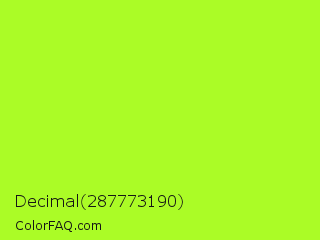 Decimal 287773190 Color is a normal green color and the nearest color is Green Yellow #adff2f. Hex code #abfc26 and RGB value is rgb(171,252,38). In RGB color space, this color is composed of 67% red, 99% green, 15% blue, In CMYK color space, this color is composed of 32% cyan, 0% magenta, 85% yellow , 1% black , In HSL color space, this color has a hue angle of 83° , 97% saturation and 57% lightness.