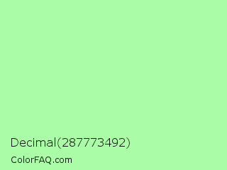 Decimal 287773492 Color is a very light green color and the nearest color is Pale Green #98fb98. Hex code #abfca6 and RGB value is rgb(171,252,166). In RGB color space, this color is composed of 67% red, 99% green, 65% blue, In CMYK color space, this color is composed of 32% cyan, 0% magenta, 34% yellow , 1% black , In HSL color space, this color has a hue angle of 117° , 93% saturation and 82% lightness.