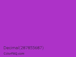 Decimal 287855687 Color is a normal purple color and the nearest color is Dark Orchid #9932cc. Hex code #ac33c7 and RGB value is rgb(172,51,199). In RGB color space, this color is composed of 67% red, 20% green, 78% blue, In CMYK color space, this color is composed of 14% cyan, 74% magenta, 0% yellow , 22% black , In HSL color space, this color has a hue angle of 289° , 59% saturation and 49% lightness.