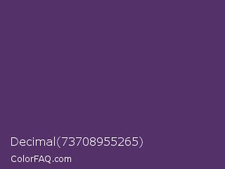 Decimal 73708955265 Color is a dark purple color and the nearest color is Imperial #602f6b. Hex code #553169 and RGB value is rgb(85,49,105). In RGB color space, this color is composed of 33% red, 19% green, 41% blue, In CMYK color space, this color is composed of 19% cyan, 53% magenta, 0% yellow , 59% black , In HSL color space, this color has a hue angle of 279° , 36% saturation and 30% lightness.
