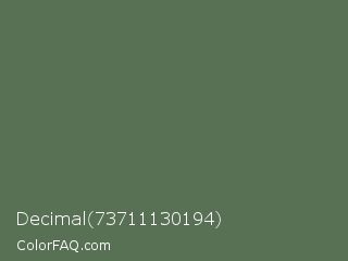 Decimal 73711130194 Color is a normal green color and the nearest color is Cactus #587156. Hex code #587154 and RGB value is rgb(88,113,84). In RGB color space, this color is composed of 35% red, 44% green, 33% blue, In CMYK color space, this color is composed of 22% cyan, 0% magenta, 26% yellow , 56% black , In HSL color space, this color has a hue angle of 112° , 15% saturation and 39% lightness.
