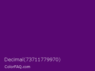 Decimal 73711779970 Color is a dark purple color and the nearest color is Pigment Indigo #4b0082. Hex code #590772 and RGB value is rgb(89,7,114). In RGB color space, this color is composed of 35% red, 3% green, 45% blue, In CMYK color space, this color is composed of 22% cyan, 94% magenta, 0% yellow , 55% black , In HSL color space, this color has a hue angle of 286° , 88% saturation and 24% lightness.