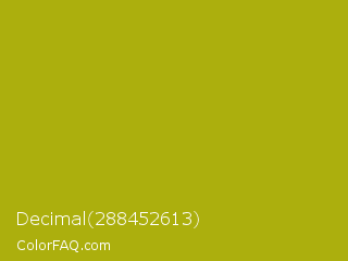 Decimal 288452613 Color is a normal yellow color and the nearest color is Sahara #b7a214. Hex code #acaf0d and RGB value is rgb(172,175,13). In RGB color space, this color is composed of 67% red, 69% green, 5% blue, In CMYK color space, this color is composed of 2% cyan, 0% magenta, 93% yellow , 31% black , In HSL color space, this color has a hue angle of 61° , 86% saturation and 37% lightness.