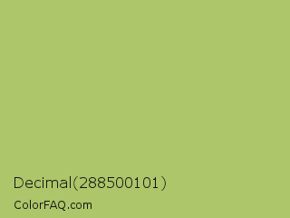 Decimal 288500101 Color is a normal lime color and the nearest color is Middle Green Yellow #acbf60. Hex code #acc669 and RGB value is rgb(172,198,105). In RGB color space, this color is composed of 67% red, 78% green, 41% blue, In CMYK color space, this color is composed of 13% cyan, 0% magenta, 47% yellow , 22% black , In HSL color space, this color has a hue angle of 77° , 45% saturation and 59% lightness.