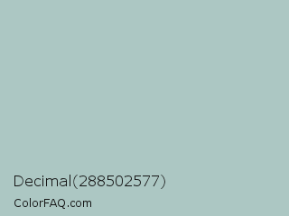 Decimal 288502577 Color is a light cyan color and the nearest color is Opal #a9c6c2. Hex code #acc7c3 and RGB value is rgb(172,199,195). In RGB color space, this color is composed of 67% red, 78% green, 76% blue, In CMYK color space, this color is composed of 14% cyan, 0% magenta, 2% yellow , 22% black , In HSL color space, this color has a hue angle of 171° , 19% saturation and 73% lightness.