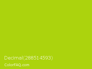 Decimal 288514593 Color is a normal lime color and the nearest color is Vivid Lime Green #a6d608. Hex code #acd30d and RGB value is rgb(172,211,13). In RGB color space, this color is composed of 67% red, 83% green, 5% blue, In CMYK color space, this color is composed of 18% cyan, 0% magenta, 94% yellow , 17% black , In HSL color space, this color has a hue angle of 72° , 88% saturation and 44% lightness.